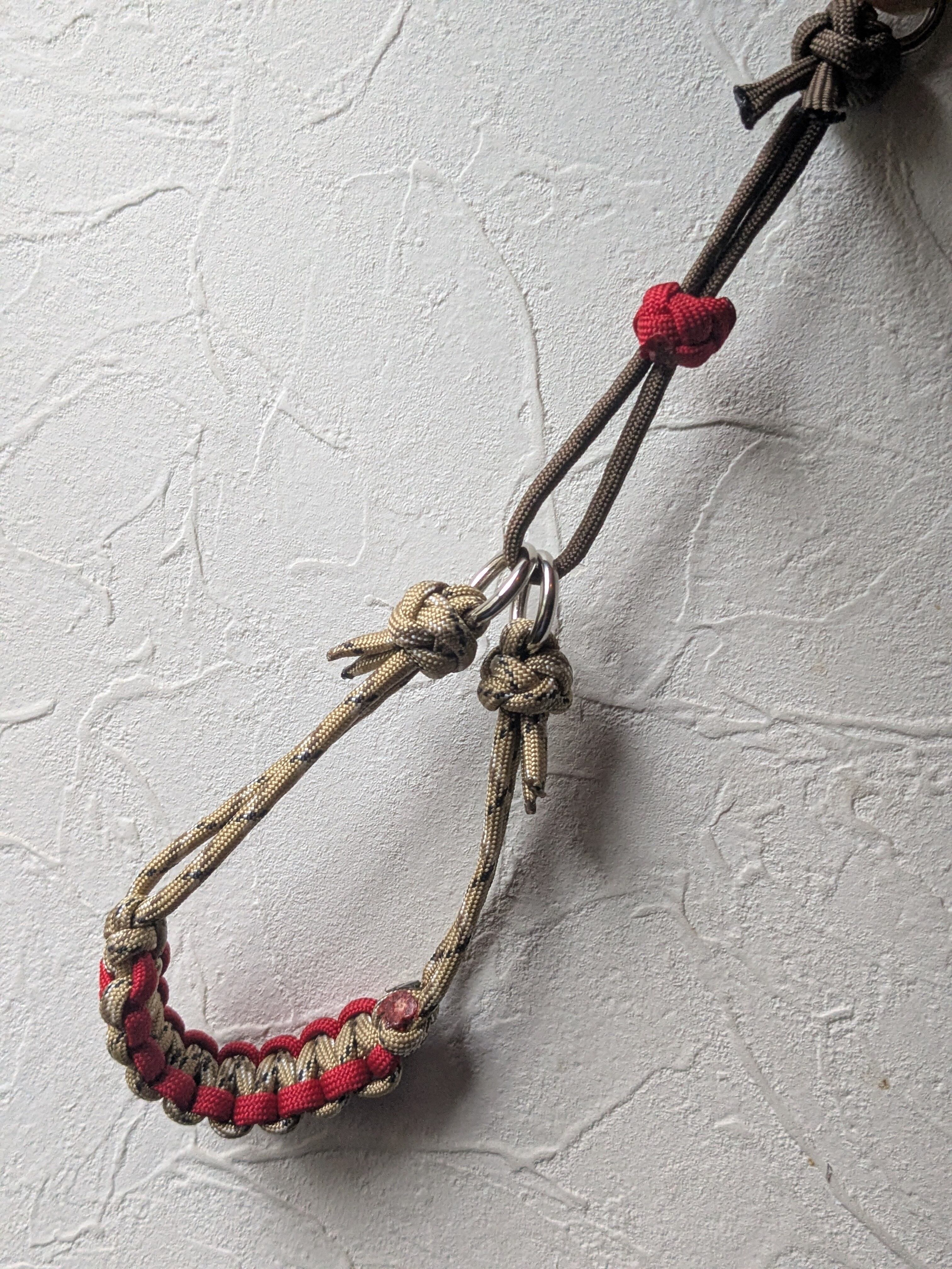 パラコードの特性上、引っ張りには強い素材ですが、噛みつきには弱い場合があります。使用中は定期的にご確認ください。