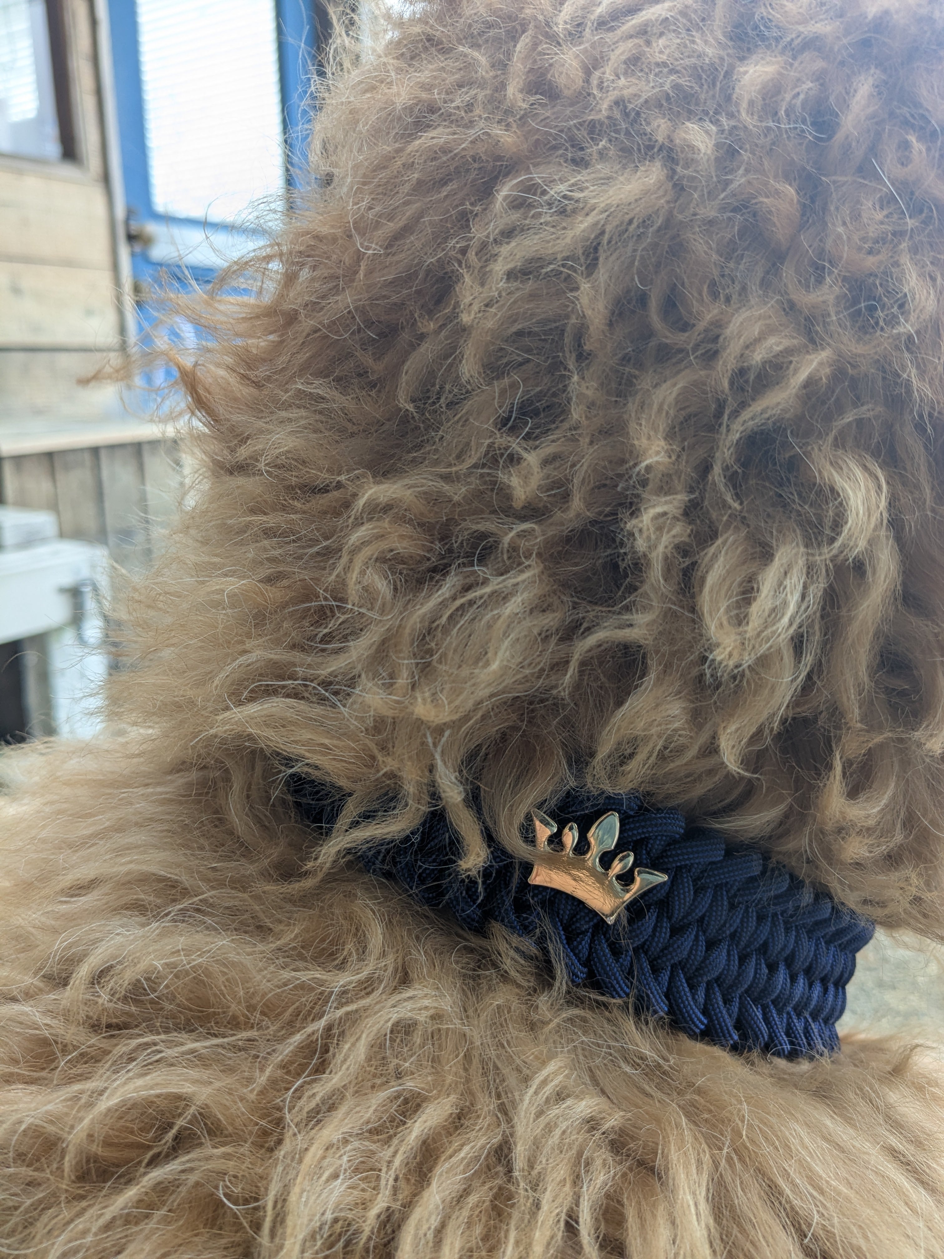 A handcrafted paracord half choke collar adorned with a gold crown charm.